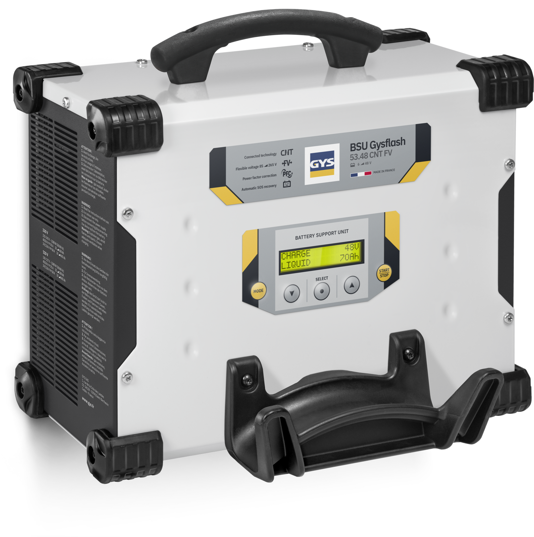 Specially designed for mounting on a wall or lift, the GYSFLASH vertical 53.48 CNT FV is a high-power 50 A CONNECTED charger with inverter technology. It keeps a 6 V, 12 V, 16 V, 24 V, 36 V, 48 V, lead acid or lithium battery at a perfectly stabilised voltage during diagnostic phases. It also guarantees optimum charge quality for servicing the most advanced vehicles. Its USB connectivity makes it 100% customisable.