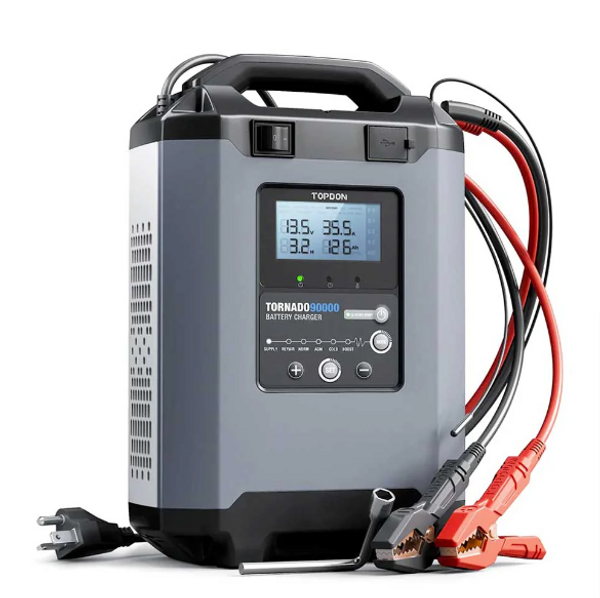 The Topdon Tornado 90000 is an industrial-grade smart charger and voltage stabilizer designed for automotive service centers and collision repair shops. This versatile device supports all types of 12V and 24V lead-acid and lithium batteries, making it ideal for battery maintenance, ECU programming, and stable power supply applications.